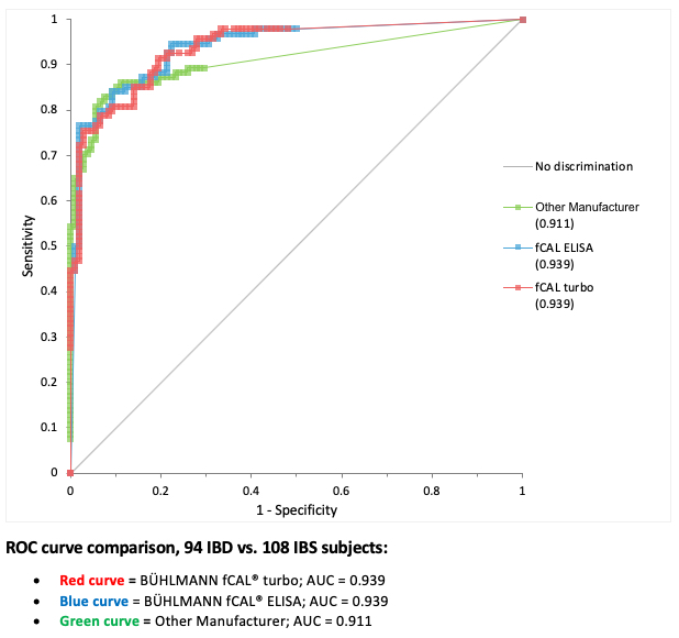 | A clinical study with a total of 248 adult and pediatric patients was performed to assess the ability of the BÜHLMANN fCAL® turbo to discriminate between patients with IBD and other non-inflammatory GI disorders, including IBS. A subset of this population (94 IBD vs 108 IBS) that included only samples that were run with another manufacturer’s assay were used to create the ROC curve below to provide a competitive comparison.